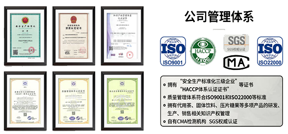 10W級GMP凈化車間,擁有CMA中國計量認證實驗室,有第三方檢測資質嚴格的質量管理體系:ISO質量管理體系/HACCP體系認證